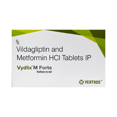 Vydlix M Forte Tablet is a combination of two anti-diabetic drugs: metformin and vildagliptin. Metformin is an anti-diabetic medicine and belongs to the class of biguanides. It lowers the glucose production in the liver, delays glucose absorption from the intestines, and increases the body's sensitivity to insulin. Vildagliptin inhibits the enzyme DPP4 and increases the release of insulin from the pancreas. This combination is not advised for patients below 18 years of age.