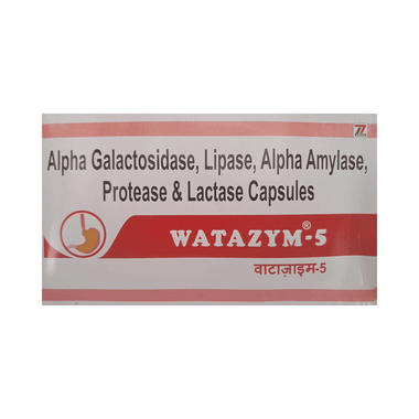 Watazym 5 Capsule is a prescription medicine used to treat indigestion and pancreatitis. It contains digestive enzymes needed by the body to help break down and digest food. It is used when the pancreas cannot make or does not release enough digestive enzymes into the gut to digest the food.