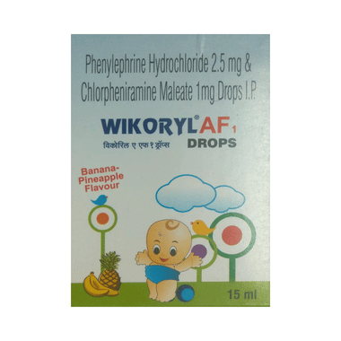 Wikoryl AF 1 Oral Drops Excludeana-Pineapple is a combination of two medicines that help to relieve the symptoms of cold. It consists of Chlorpheniramine, an antiallergic that relieves allergy symptoms like runny nose, watery eyes, and sneezing. It also consists of Phenylephrine, a decongestant that narrows the small blood vessels providing relief from congestion or stuffiness in the nose.