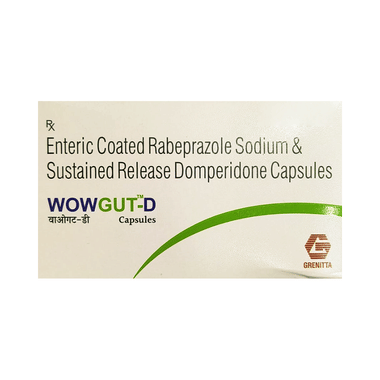 Wowgut-D Capsule SR is a combination of two medicines: Domperidone and Rabeprazole. This combination is used to treat acidity and heartburn or gastroesophageal reflux disease (GERD); a condition where the acid in the stomach flows back up into the food pipe (esophagus). It is also used to treat gastric and duodenal ulcers. Domperidone helps to control vomiting by increasing the movement of the gut, allowing the food to move more easily through the stomach.