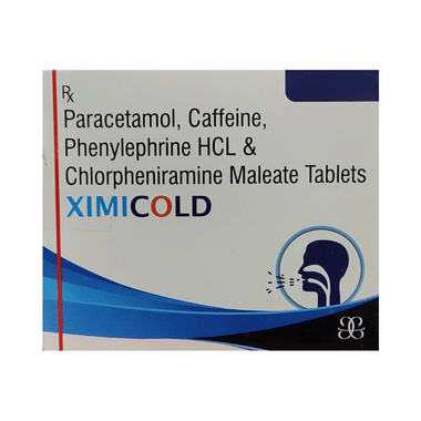 Ximicold Tablet is a combination of four medicines: Caffeine, Chlorpheniramine, Paracetamol and Phenylephrine. This combination is helpful in relieving the symptoms of cold. These symptoms may include body ache, headache, fatigue, fever, watery eyes, sneezing, cough, sore throat, and runny and stuffy nose.